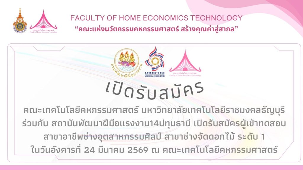 การประกวดแข่งขันการประกอบอาหารฟิวชั่นมกราคม 4, 2019ยอดครูตัวอย่างของนักศึกษาคณะเทคโนโลยีคหกรรมศาสตร์ บนเส้นทางประสบการณ์กว่า 24 ปีมกราคม 12, 2019 Published by Prompong Tongjumrern on มกราคม 4, 2019 Categories กิจกรรมภายในคณะ ข่าวประชาสัมพันธ์ Tags Share0 Prompong Tongjumrern Related postsมีนาคม 10, 2026เปิดรับสมัครผู้เข้าทดสอบมาตรฐานฝีมือแรงงาน สาขาอาชีพช่างอุตสาหกรรมศิลป์ สาขาช่างจัดดอกไม้ ระดับ 1Read moreมีนาคม 6, 2026บุคลากรสายสนับสนุน คณะเทคโนโลยีคหกรรมศาสตร์ เข้าร่วมโครงการอบรม R2R Training 2026Read moreมีนาคม 6, 2026เปิดรับสมัครผู้เข้าทดสอบมาตรฐานฝีมือแรงงาน สาขาผู้ประกอบอาหารไทย ระดับ 1 ศูนย์ทดสอบมาตรฐานฝีมือแรงงานRead more Comments are closed.